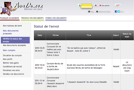 AcaDemon est un site de partage de documents académiques. Achetez ou vendez vos documents de façon fiable. Lorsque vous vendez des documents, ils sont épluchés puis validés si ils sont conformes. (Attention : le document doit être suffisament long, et doit comporté les sources du document. C'est un bon moyen de gagner de l'argent de poche.